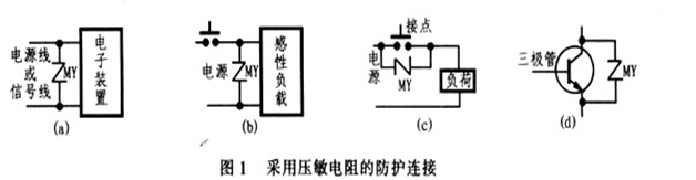第一種類型是電源線之間或電源線和大地之間的連接,如圖1(a)所示。作為壓敏電阻器,最具有代表性的使用場合是在電源線及長距離傳輸的信號線遇到雷擊而使導線存在浪湧脈衝等情況下對電子產品起保護作用。一般線上間接入壓敏電阻器可對線間的感應脈衝有效,而線上與地間接入壓敏電阻則對傳輸線和大地間的感應 脈衝有效。若進一步將線間連接與線地連接兩種形式組合起來,則可對浪湧脈衝有更好的吸收作用。